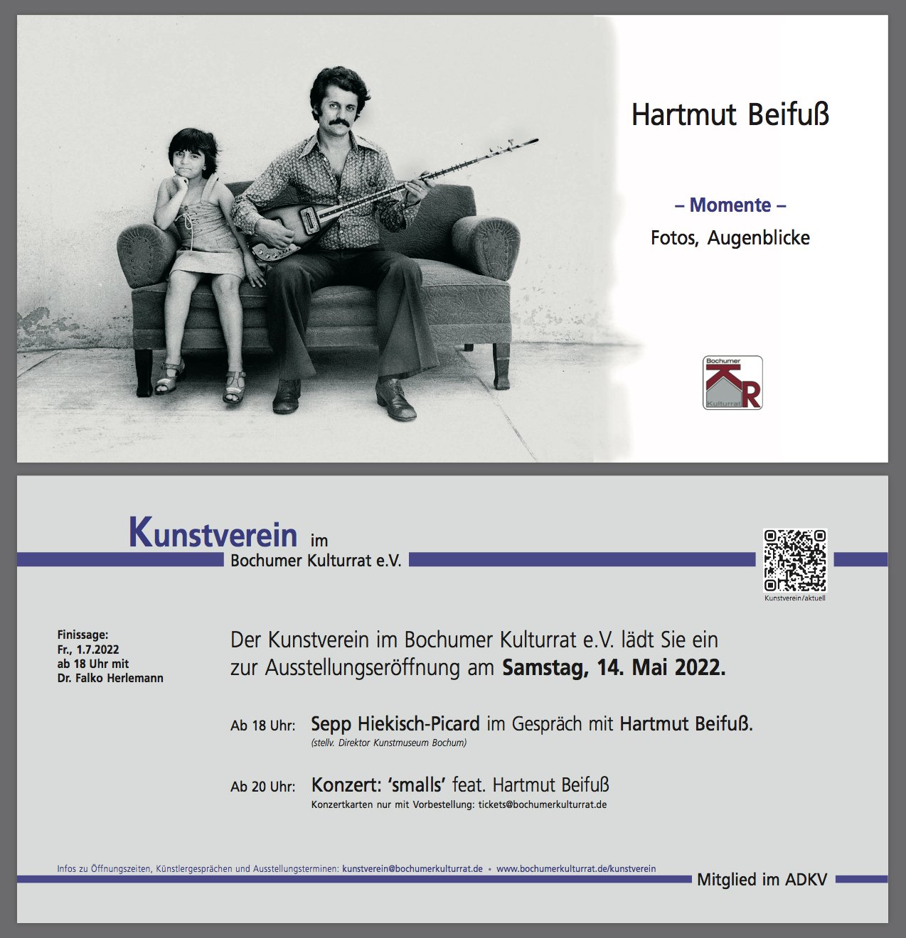 HARTMUT BEIFUSS - MOMENTE, FOTOS, AUGENBLICKE 14. Mai bis 1. Juli 2022 Vernissage am 14. Mai 2022 ab 18 Uhr mit dem stellvertretenden Leiter des Kunstmuseums Bochum, Sepp Hiekisch-Picard. Gezeigt werden SW-Fotografien des renommierten Fotografen und World-Press-Preisträgers Hartmut Beifuß – Kultur und Alltag im Ruhrgebiet und an anderen Orten. Der Besuch setzt jeweils das Tragen einer medizinischen Maske voraus. Die Ausstellung im KulturMAGAZIN Lothringen ist immer mittwochs von 14-16 Uhr und donnerstags von 17-20 Uhr geöffnet. Besuchs- und Künstlergesprächstermine können zusätzlich vereinbart werden unter 0234-862012. ➞ Der Flyer (PDF)
