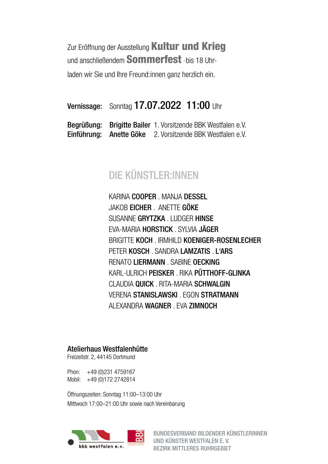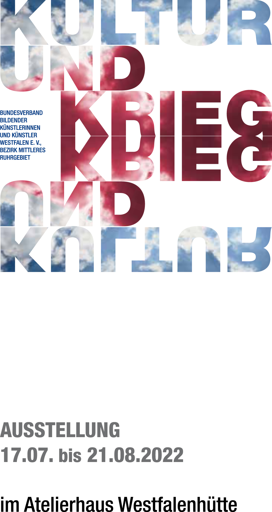 "KULTUR UND KRIEG - 2022" 10. Juli 2022 bis zum 21. August 2022 Die gesamte Kunst- und Kulturszene musste und muss noch durch die Pandemie und sich nun auch mit der aktuellen Situation des Krieges in Europa auseinandersetzen und weiterhin leben. Dieses möchte die Ausstellung unter dem Titel "Kultur und Krieg 2022" im Atelierhaus Westfalenhütte in Dortmund thematisieren. Ausstellung des BBK Westfalen e.V., Bezirk Mittleres Ruhrgebiet, im Atelierhaus Westfalenhütte, Freizeitstraße 2, 44145 Dortmund Vernissage: 10. Juli 2022 ➞ Der Flyer (PDF)