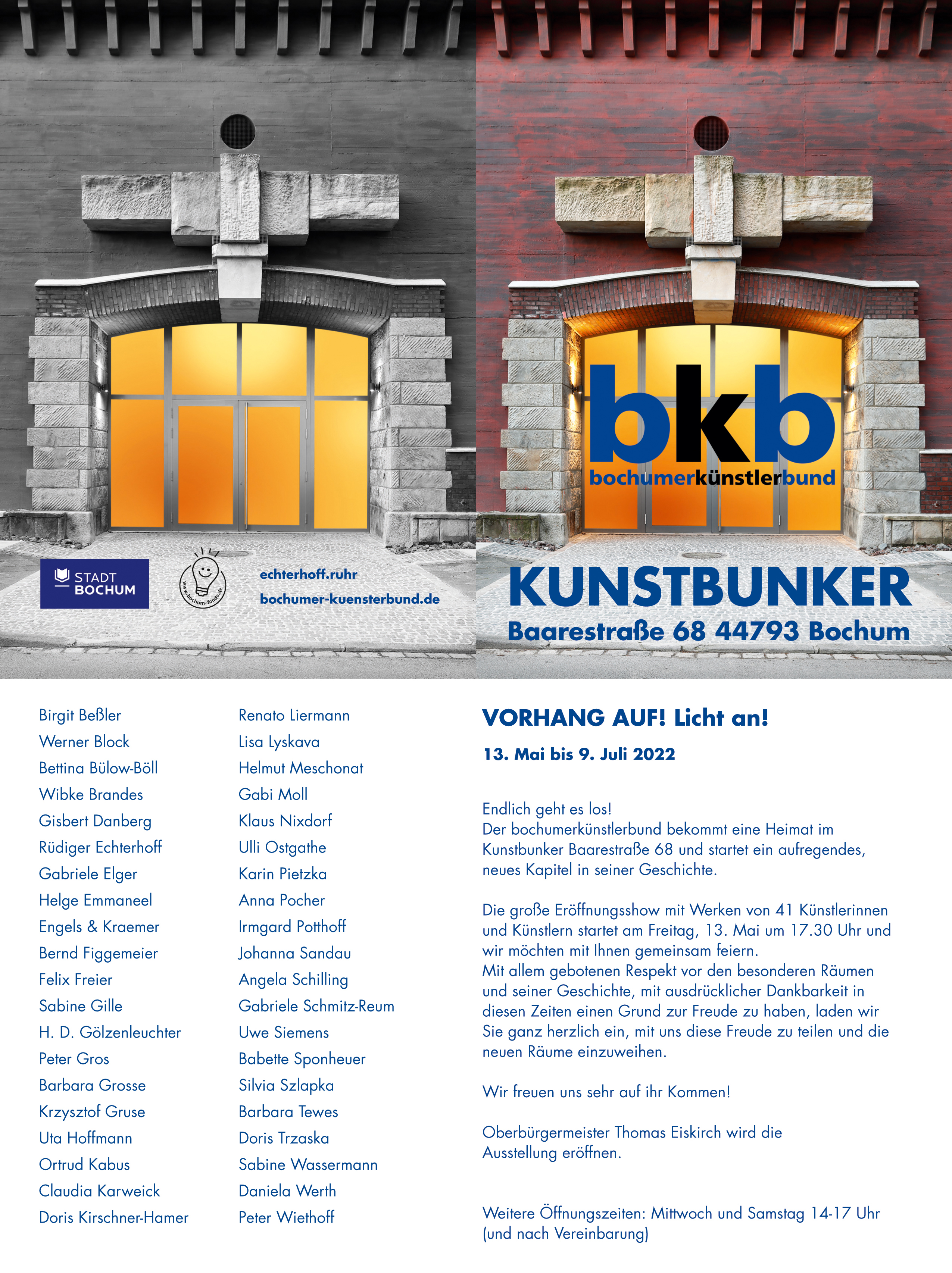 VORHANG AUF! LICHT AN! 13. Mai bis 9. Juli 2022 Vernissage am 13. Mai 2022 ab 17.30 mit dem Bochumer Oberbürgermeister Thomas Eiskirch u.v.a. Gästen, hier zeige ich zusammen mit weiteren Bochumer Künstler*innen einige neue Arbeiten: Kunstbunker, Barrestr. 68, 44793 Bochum. Die Ausstellung geht noch bis zum 9. Juli. Der Besuch setzt jeweils das Tragen einer medizinischen Maske voraus. ➞ Der Flyer (PDF), Vorderseite