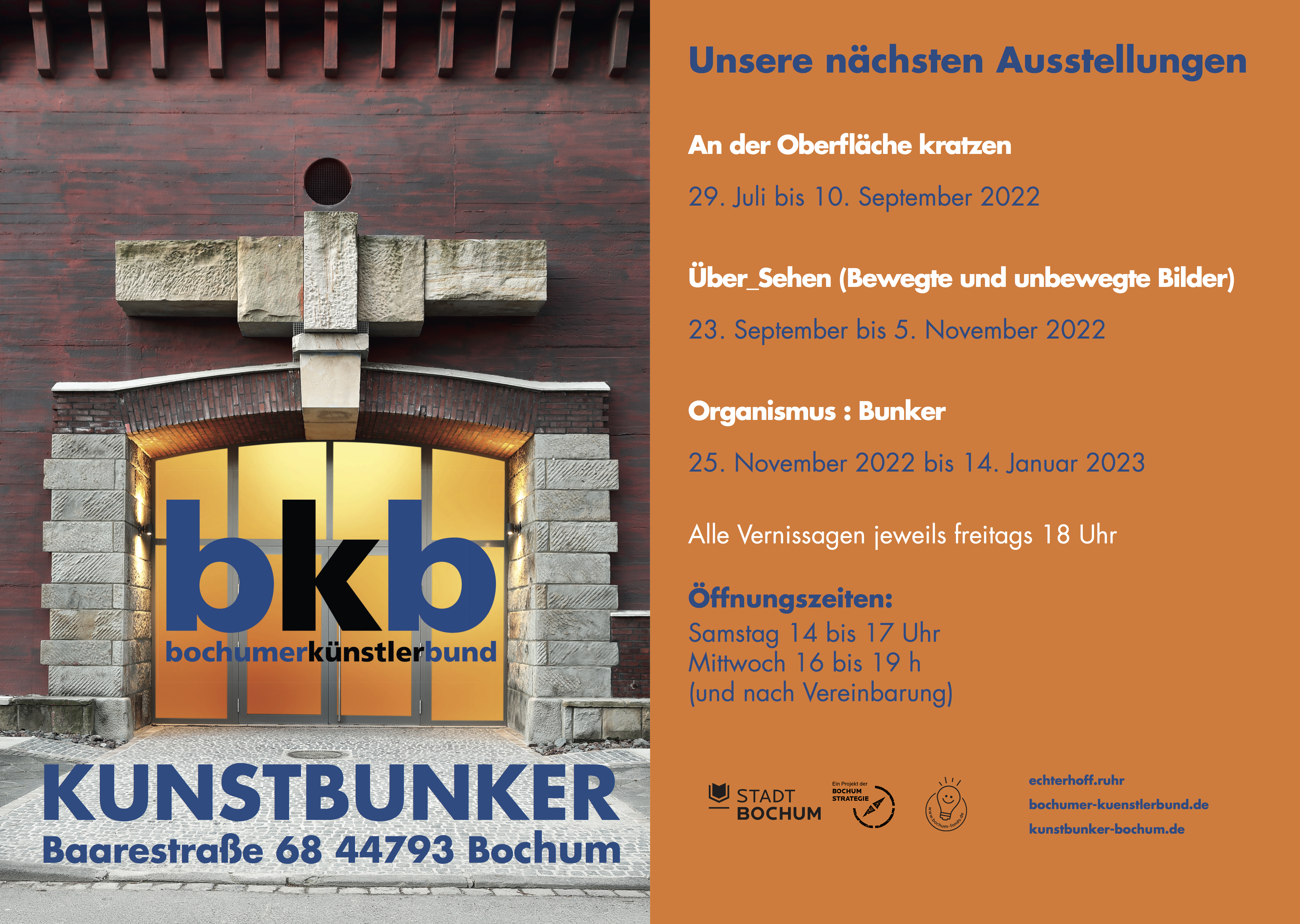 "DUNKELSCHÖN" 27.1. bis 18.3.2023 / Kunstbunker Bochum Mit einer umfangreichen Präsentation startet der Bochumer Künstlerbund ins neue Jahr. So freue ich mich, euch zu meiner ersten Ausstellungsbeteiligung in 2023 einzuladen. Vernissage: 27. Januar ab 18 Uhr, im Kunstbunker Bochum, Baarestraße 68. ➞ Der bochumerkünstlerbund bkb |