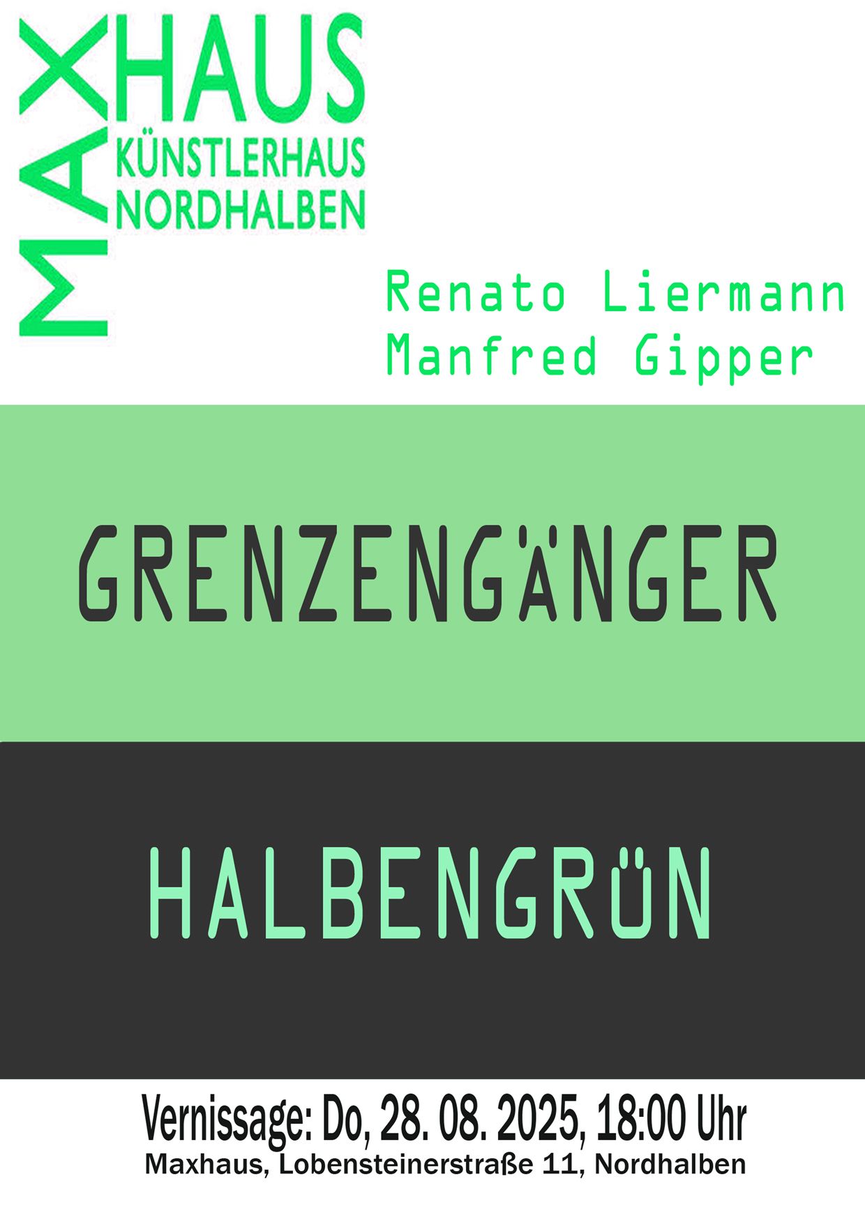 GRENZENGÄNGER HALBENGRÜN ARTIST IN RESIDENCE und AUSSTELLUNG 9. – 30. August 2025 Renato Liermann zusammen mit dem Berliner Künstler Manfred Gipper im Maxhaus, Künstlerhaus Nordhalben, mit Malereien, Collagen und Installationen. Vernissage am 28. August ab 18 Uhr, Einführung durch Otmar Adler, Künstlergespräch. Manfred Gipper und Renato Liermann zeigen neu entstandene Malereien, Grafiken, Collagen und Installationen. Sie thematisieren Veränderungsprozesse, Kontraste und Brüche, auch die alltäglichen Besonderheiten, die aus der abwechslungsreichen Geschichte Nordhalbens resultieren. Sie werden dabei zu Grenzengängern - historisch wie in ihrer künstlerischen Arbeit. Maxhaus, Künstlerhaus Nordhalben, Lobensteiner Straße 11, 96365 Nordhalben ➞ dazu ein Bericht in der Neuen Presse, Coburg, vom 27.8.2025 |