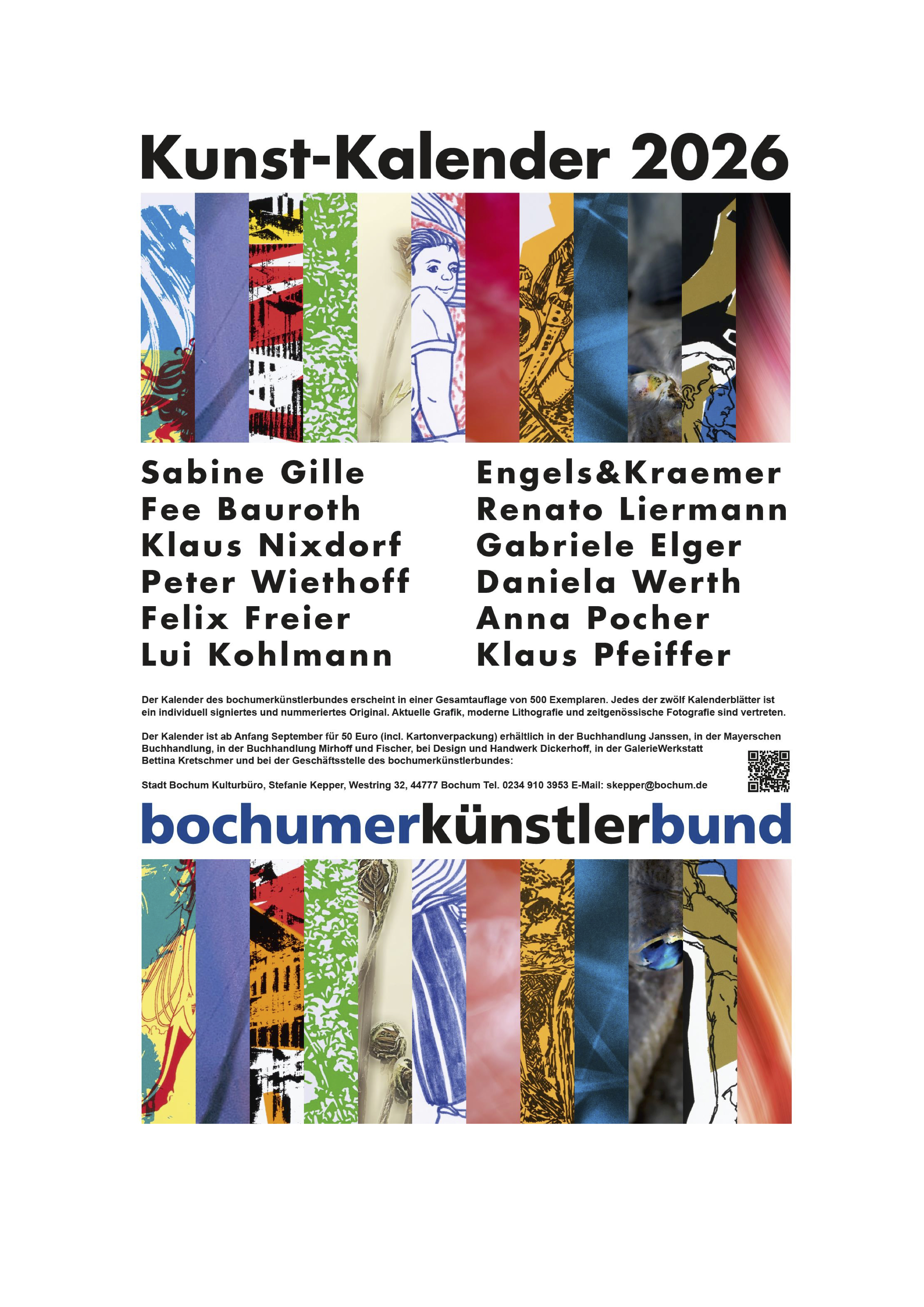 KUNSTKALENDER 2026 des bkb Ab sofort liegt der wieder sehr gelungene Jahreskalender 2026 des bochumerkünstlerbundes mit 12 signierten Originalblättern vor. Mein Beitrag ist der August. |