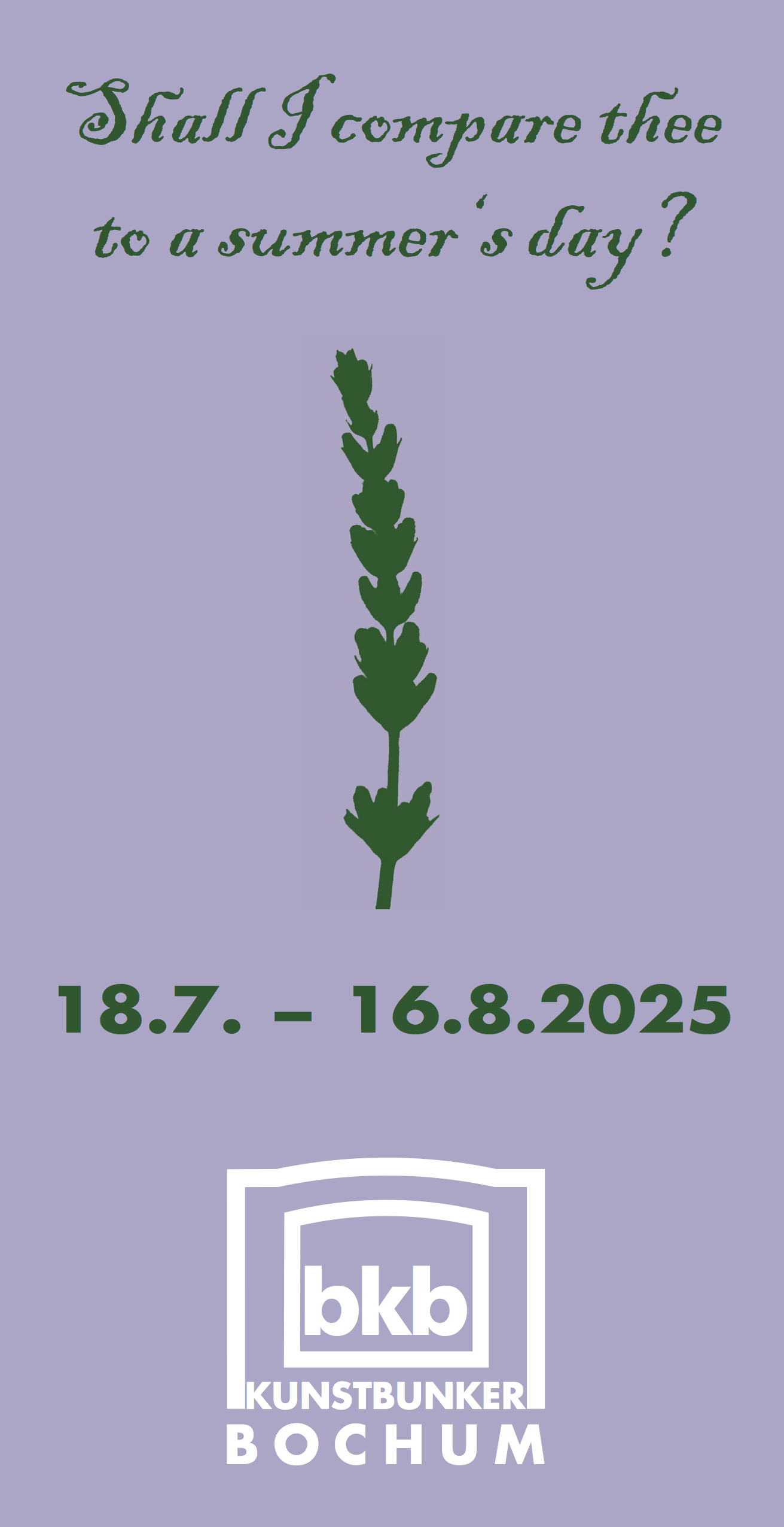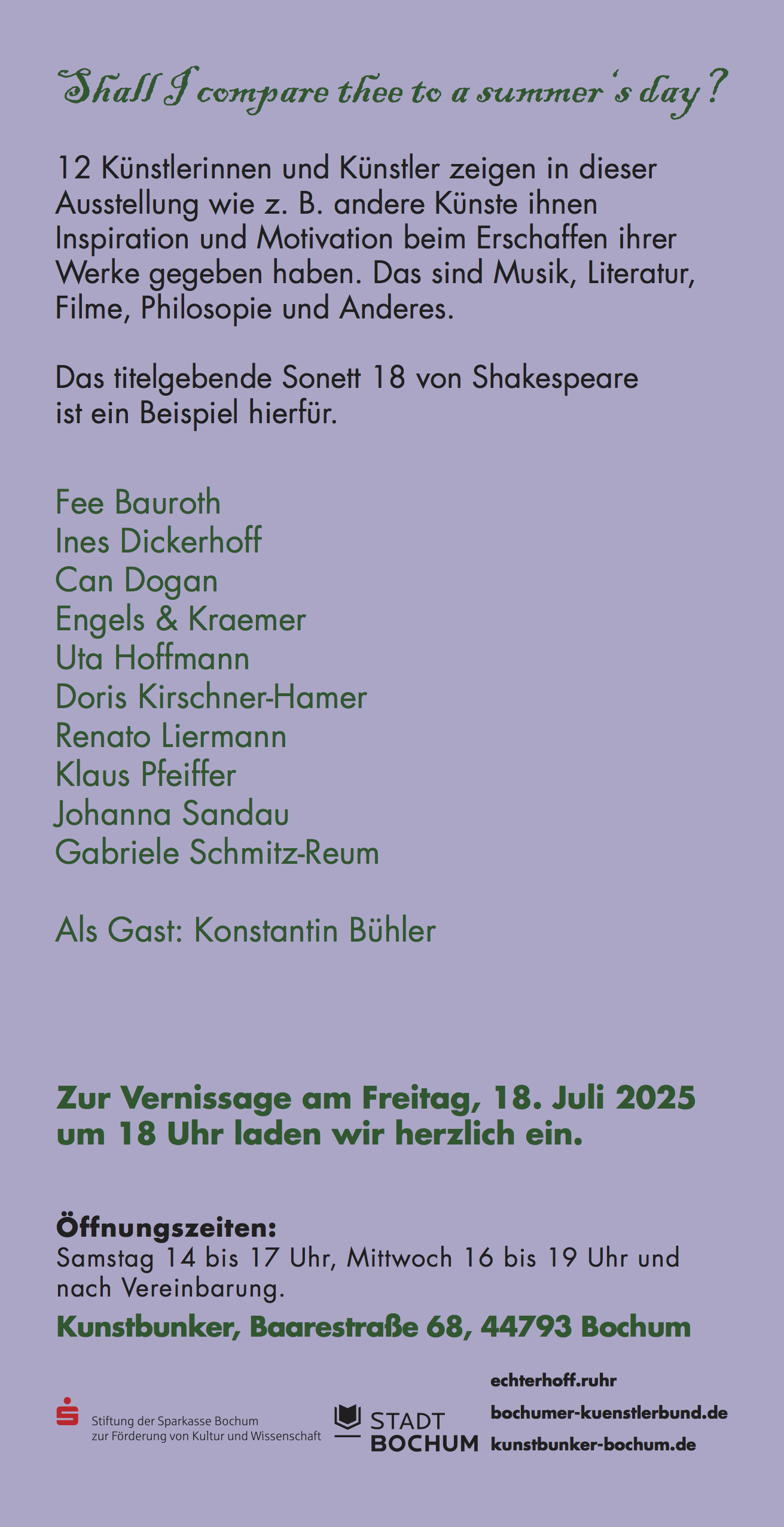 SHALL I COMPARE THEE TO A SUMMER'S DAY? 18.7. bis 16.8.2025 12 Künstlerinnen und Künstler zeigen in dieser Ausstellung, wie z. B. andere Künste ihnen Inspiration und Motivation beim Erschaffen ihrer Werke gegeben haben. Das sind Musik, Literatur, Filme, Philosophie und anderes. Zur Vernissage am Freitag, 18. Juli 2025 um 18 Uhr, wird herzlich eingeladen. Kunstbunker, Baarestr. 68, 44793 Bochum. Geöffnet Sa. 14-17 Uhr und Mi. 16-19 Uhr u.n.V. ➞ Der Flyer dazu (PDF) |