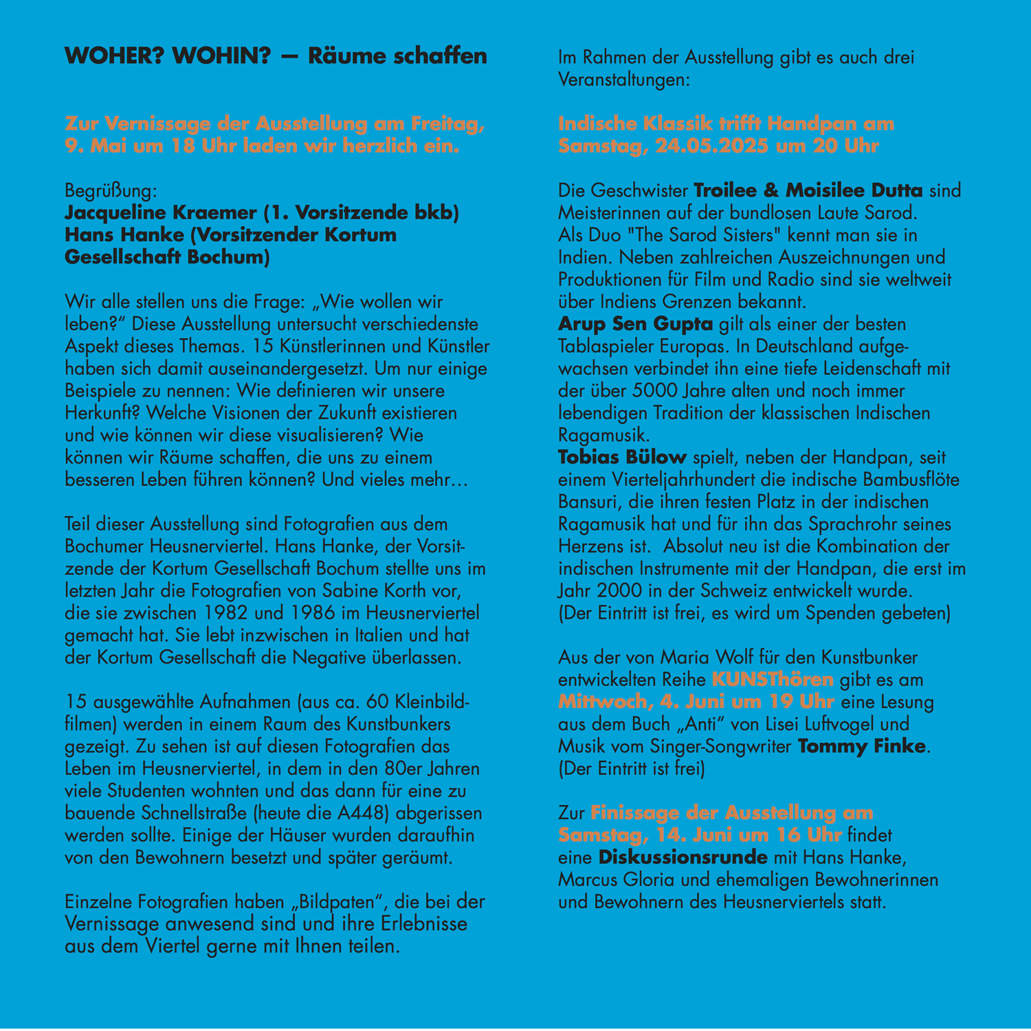 "WOHER? WOHIN?" 9.5. bis 14.6.2025 Diese Ausstellung untersucht verschiedenste Aspekt dieses Themas. 15 Künstlerinnen und Künstler haben sich damit auseinandergesetzt. Um nur einige Beispiele zu nennen: Wie definieren wir unsere Herkunft? Welche Visionen der Zukunft existieren, und wie können wir diese visualisieren? Wie können wir Räume schaffen, die uns zu einem besseren Leben führen können? Und vieles mehr … Zur Vernissage am Freitag, 9. Mai 2025 um 18 Uhr, wird herzlich eingeladen. Kunstbunker, Baarestr. 68, 44793 Bochum. Geöffnet Sa. 14-17 Uhr und Mi. 16-19 Uhr u.n.V. ➞ Der Flyer dazu (PDF) |