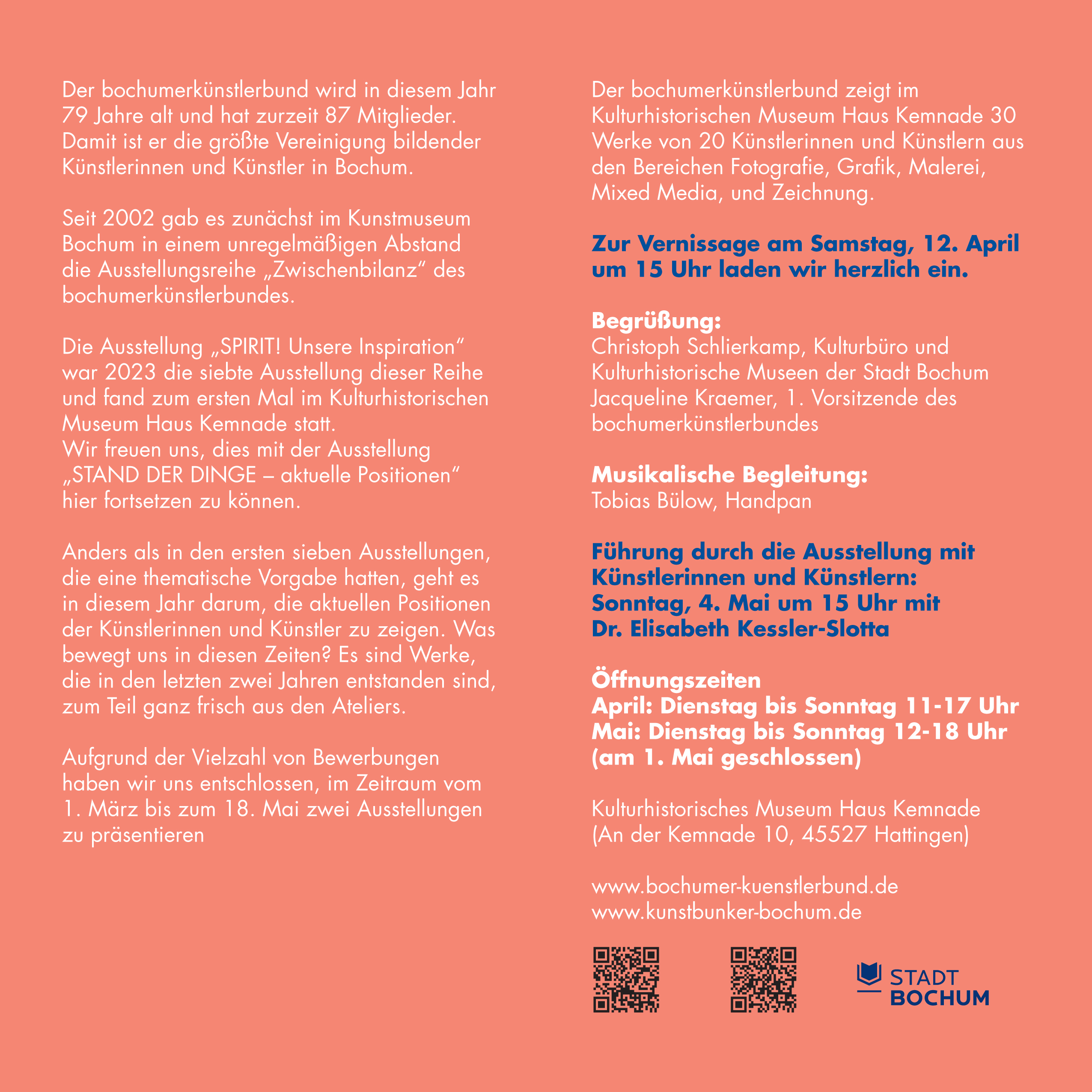 STAND DER DINGE "Zwischenbilanz VIII", vom 12.4. bis 18.5.2025, Im Kulturhistorischen Museum Haus Kemnade, An der Kemnade 10, 45527 Hattingen. Begrüßung: Christoph Schlierkamp, Kulturbüro und Kulturhistorische Museen der Stadt Bochum, Jacqueline Kraemer, 1. Vorsitzende des bochumerkünstlerbundes. Musikalische Begleitung: Tobias Bülow, Handpan. Mit zwanzig Künstlerinnen und Künstlern des bochumerkünstlerbundes. Führung durch die Ausstellung mit Künstlerinnen und Künstlern: Sonntag, 4. Mai um 15 Uhr mit Dr. Elisabeth Kessler-Slotta. Öffnungszeiten im April: Dienstag bis Sonntag 11-17 Uhr, im Mai: Dienstag bis Sonntag 12-18 Uhr (am 1. Mai geschlossen) ➞ Der Flyer dazu (PDF) |